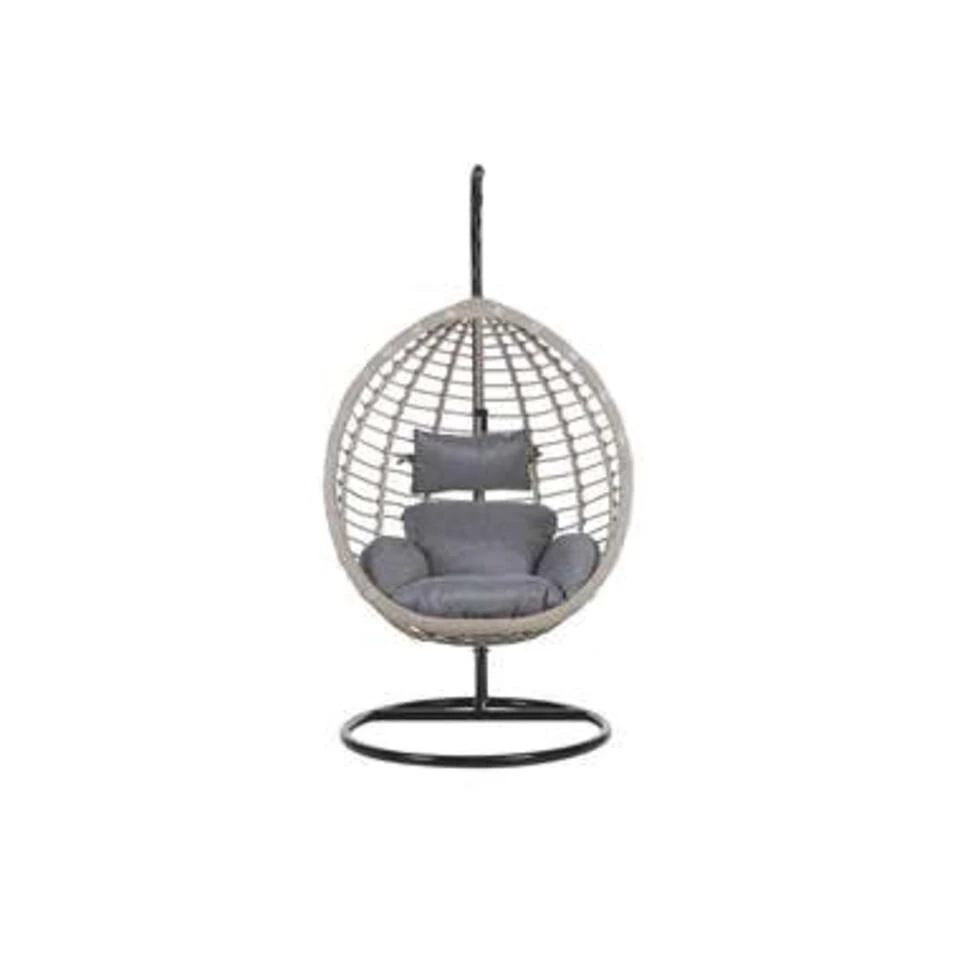 Rotan hangstoel in stevig zwart metalen frame inclusief kussens. In woonkamer, wintertuin of balkon – deze stijlvolle hangstoel van onderhoudsvriendelijk polyrotan heeft een stabiel stalen frame en kan daardoor overal geplaatst worden. De mand is stevig bevestigd via een ketting waardoor hij zachtjes wiegen. De twee comfortabele, stevige kussens zijn waterbestendig.